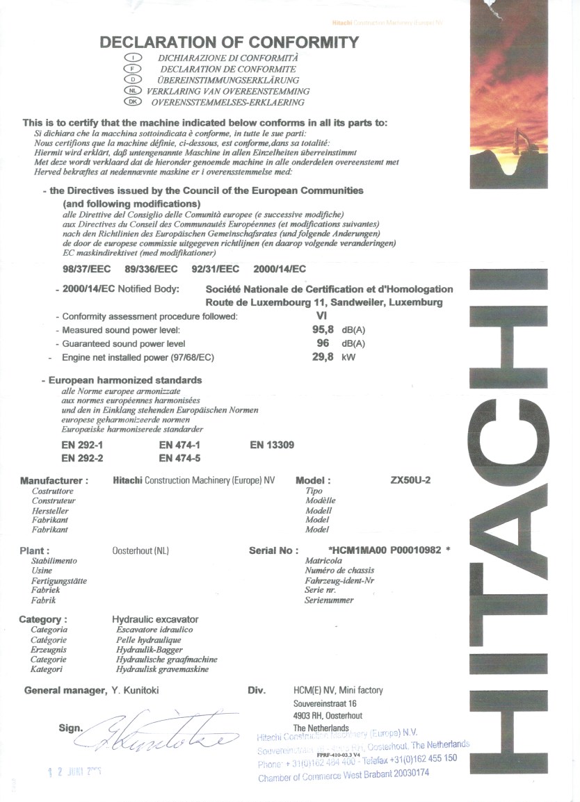 Miniescavatore Hitachi ZX50U-2, anno di vendita 2007, ore di lavoro 2910, macchina pari al nuovo con cingoli in gomma, avambraccio lungo, impianto martello, cabina ribaltabile con radio e predisposizione aria condizionata, certificato CE e libretto di manutenzione, 1 benna da scavo da 600 nuova.